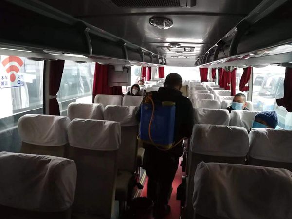 圖為車(chē)站員工給客車(chē)進(jìn)行消毒