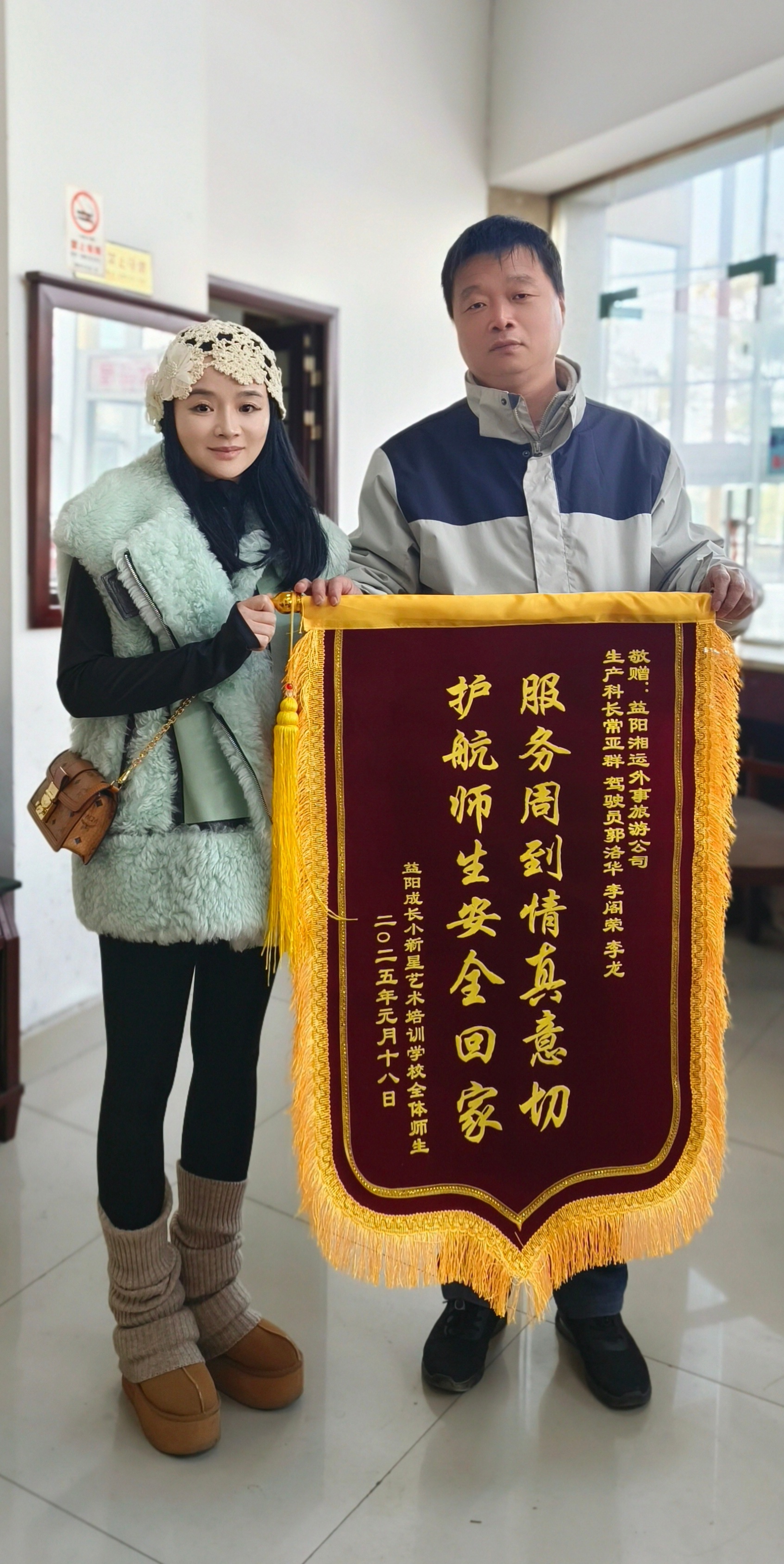 1月18日,益陽成長小新星藝術(shù)培訓(xùn)學(xué)校負責(zé)人到外事旅游運輸分公司送上“服務(wù)周到情真意切,護航師生安全回家”的錦旗。這是她們感謝公司生產(chǎn)科長常亞群以及駕駛員郭洛華、李閣榮、李龍的貼心服務(wù)。