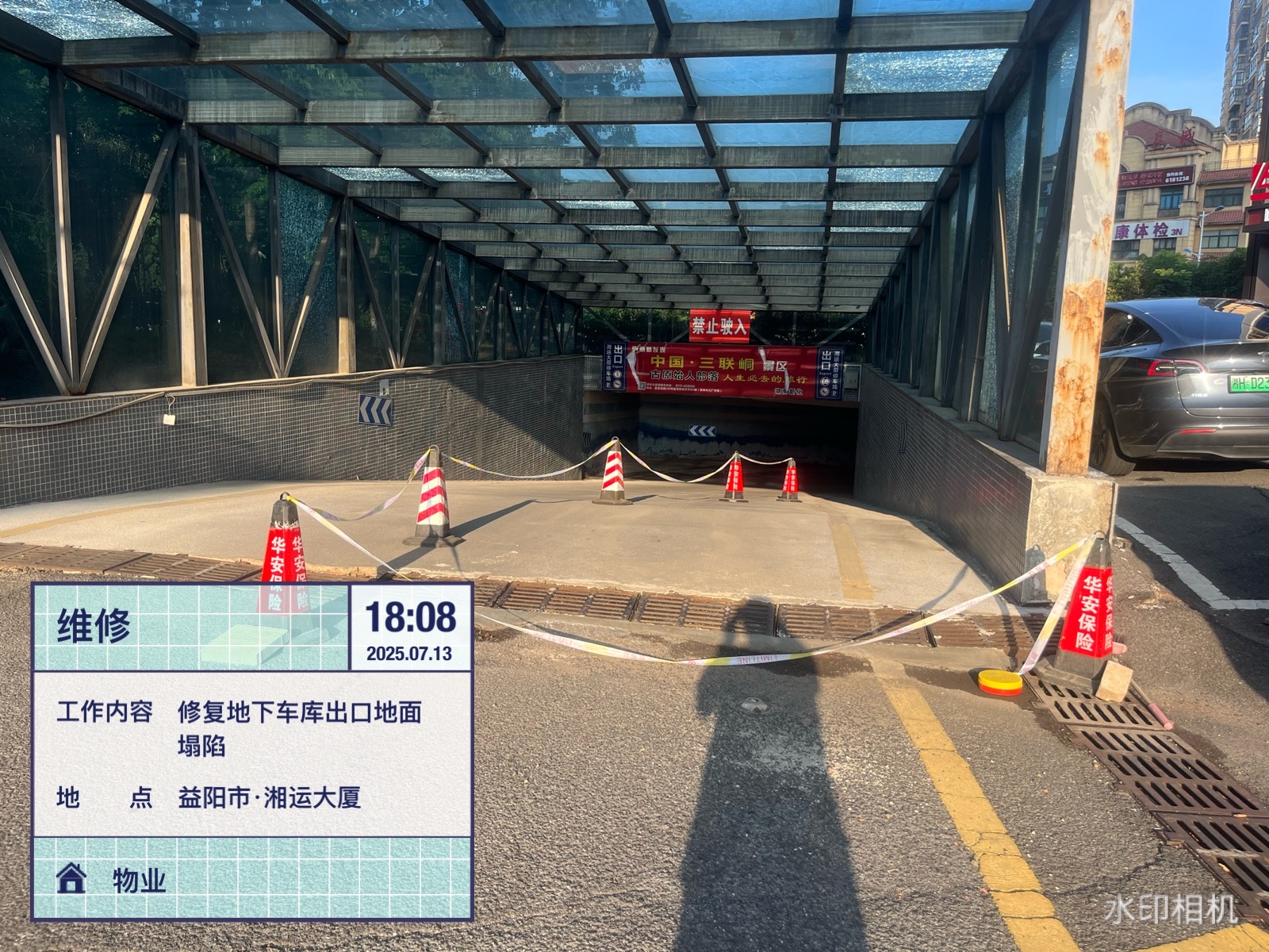 7月13日18:08,湘運大廈前坪地下車庫出口處,幾名工作人員正頂著烈日、冒著酷暑在施工。原來這是湖南遠程建設集團有限公司物業(yè)部正在對其地面塌陷情況進行修復,確保路面能正常通行。